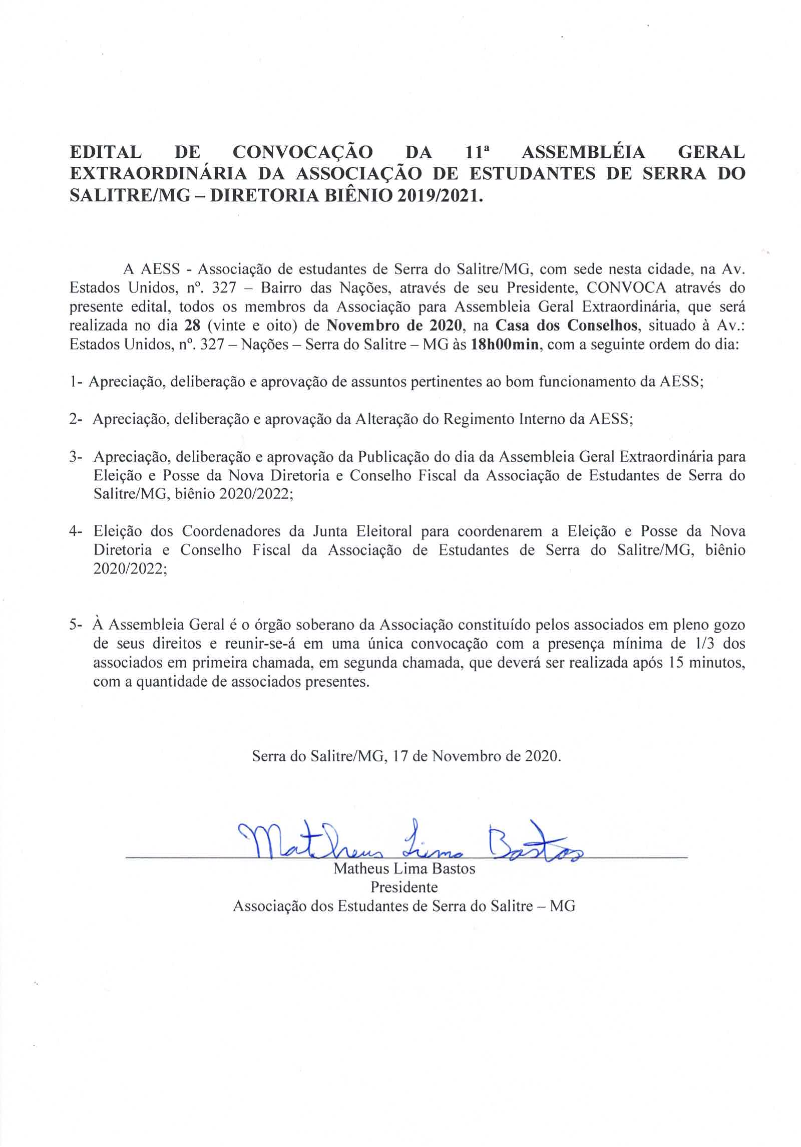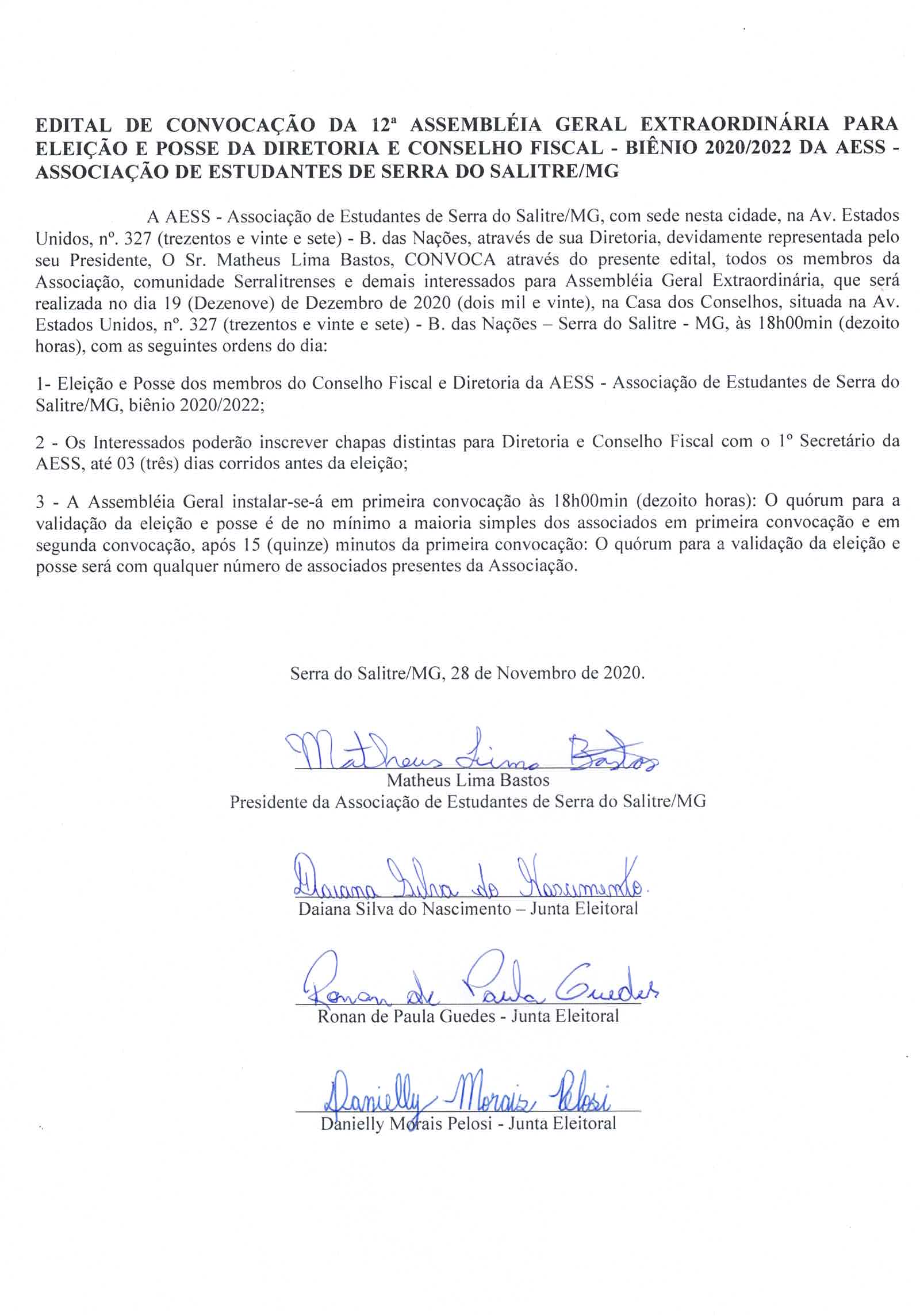AESS - Associação de estudantes de Serra do Salitre/MG, CONVOCA todos os membros da Associação p