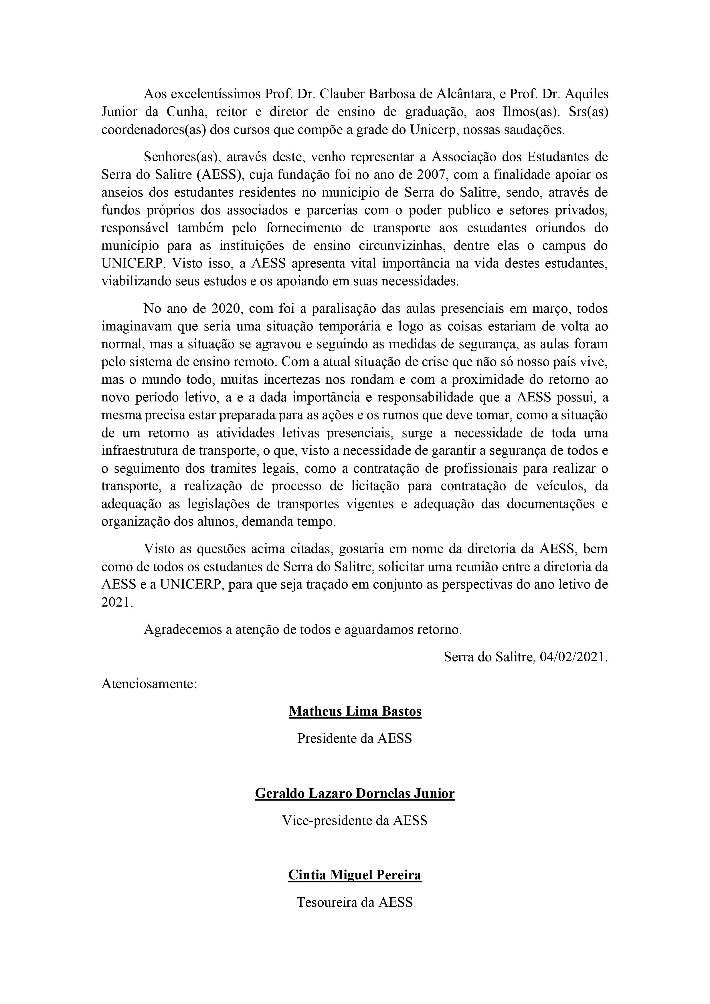 A Associação de Estudantes de Serra do Salitre - AESS, no dever de suas obrigações junto aos associados, cobra um posicionamento das duas principais Instituições de Ensino Superior - UNICERP - Patrocínio e UNIPAM - Patos de Minas, quanto ao inicio do ano letivo de 2021.